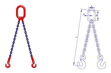 该索具可以作为双肢捆绑索具使用,当双肢捆绑索具使用时只需将吊钩钩入链条, 此时额定载荷将降低
